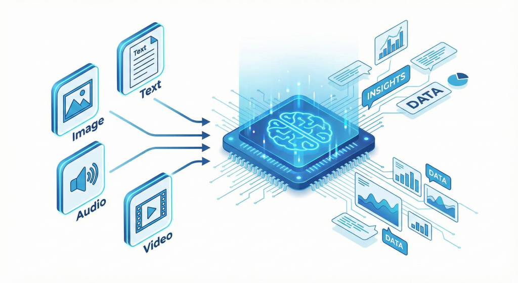 マルチモーダルAI(Multimodal AI)とは、テキスト、画像、音声、動画など、異なる種類の情報(モダリティ)を同時に処理・統合して理解するAIのことです。